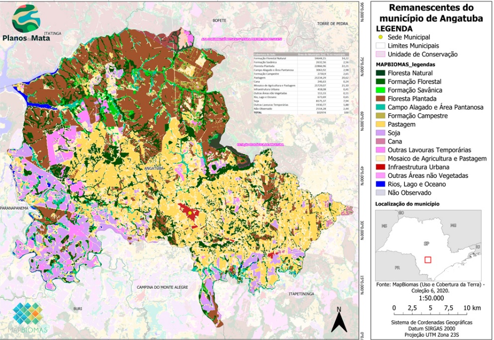 Vale ressaltar que o município, não apenas o perímetro urbano, precisa com urgência ser revitalizado na questão ambiental, árvores nativas diminuíram assustadoramente mesmo na zona rural, pastagens, eucaliptos e pinus, tomaram conta de uma extensa área a ponto de afetar inclusive as nascentes de água, algo muito sério que há tempo já vinha sendo alertado pela Associação Verde de Angatuba (AVA), órgão igualmente destacado na proteção da natureza nas últimas décadas. Ainda, na primeira década deste século foi constatado que o município de Angatuba conta com cerca de apenas 8% de sua mata nativa (no mapa abaixo os pontos em verde escuro são o que sobrou do que era a vegetação natural), a conhecida floresta estacional semidecidual, que se compõe da vegetação pertencente ao bioma da Mata Atlântica.